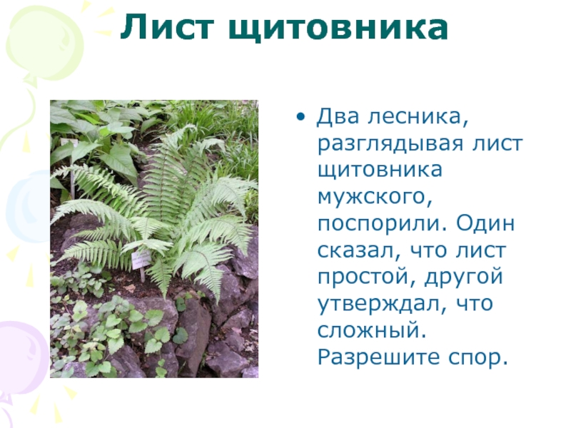 Два лесника, разглядывая лист щитовника мужского, поспорили. Один сказал,