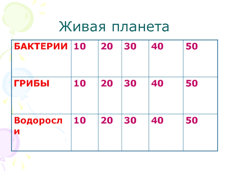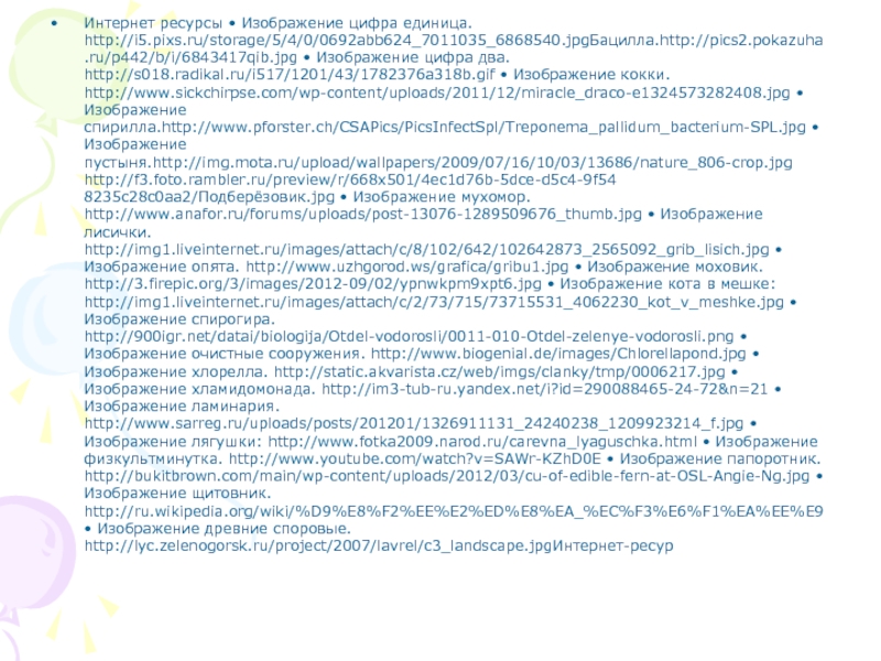 http://s018.radikal.ru/i517/1201/43/1782376a318b.gif • Изображение кокки. http://www.sickchirpse.com/wp-content/uploads/2011/12/miracle_draco-e1324573282408.jpg • Изображение спирилла.http://www.pforster.ch/CSAPics/PicsInfectSpl/Treponema_pallidum_bacterium-SPL.jpg • Изображение пустыня.http://img.mota.ru/upload/wallpapers/2009/07/16/10/03/13686/nature_806-crop.jpg http://f3.foto.rambler.ru/preview/r/668x501/4ec1d76b-5dce-d5c4-9f54 8235c28c0aa2/Подберёзовик.jpg • Изображение мухомор. http://www.anafor.ru/forums/uploads/post-13076-1289509676_thumb.jpg • Изображение лисички. http://img1.liveinternet.ru/images/attach/c/8/102/642/102642873_2565092_grib_lisich.jpg • Изображение опята. http://www.uzhgorod.ws/grafica/gribu1.jpg • Изображение моховик. http://3.firepic.org/3/images/2012-09/02/ypnwkpm9xpt6.jpg • Изображение кота в мешке: http://img1.liveinternet.ru/images/attach/c/2/73/715/73715531_4062230_kot_v_meshke.jpg • Изображение спирогира. http://900igr.net/datai/biologija/Otdel-vodorosli/0011-010-Otdel-zelenye-vodorosli.png • Изображение очистные сооружения. http://www.biogenial.de/images/Chlorellapond.jpg • Изображение хлорелла. http://static.akvarista.cz/web/imgs/clanky/tmp/0006217.jpg • Изображение хламидомонада. http://im3-tub-ru.yandex.net/i?id=290088465-24-72&n=21 • Изображение ламинария. http://www.sarreg.ru/uploads/posts/201201/1326911131_24240238_1209923214_f.jpg • Изображение лягушки: http://www.fotka2009.narod.ru/carevna_lyaguschka.html • Изображение физкультминутка. http://www.youtube.com/watch?v=SAWr-KZhD0E • Изображение папоротник. http://bukitbrown.com/main/wp-content/uploads/2012/03/cu-of-edible-fern-at-OSL-Angie-Ng.jpg • Изображение щитовник. http://ru.wikipedia.org/wiki/%D9%E8%F2%EE%E2%ED%E8%EA_%EC%F3%E6%F1%EA%EE%E9 • Изображение древние споровые. http://lyc.zelenogorsk.ru/project/2007/lavrel/c3_landscape.jpgИнтернет-ресур