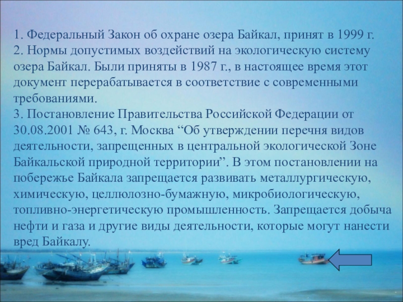 3. Постановление Правительства Российской Федерации от 30.08.2001 № 643, г. Москва “Об утверждении перечня видов деятельности, запрещенных в центральной экологической Зоне Байкальской природной территории”. В этом постановлении на побережье Байкала запрещается развивать металлургическую, химическую, целлюлозно-бумажную, микробиологическую, топливно-энергетическую промышленность. Запрещается добыча нефти и газа и другие виды деятельности, которые могут нанести вред Байкалу.