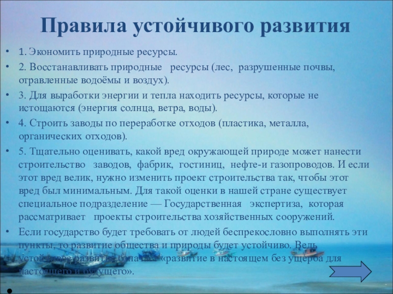 Если государство будет требовать от людей беспрекословно выполнять эти пункты, то развитие общества и природы будет устойчиво. Ведь устойчивое развитие означает «развитие в настоящем без ущерба для настоящего и будущего».