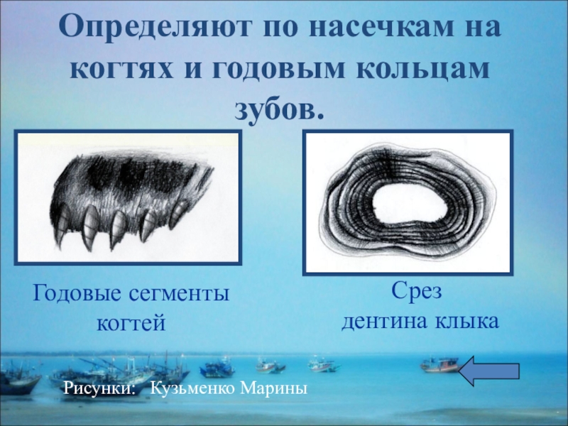 Слайд 10Определяют по насечкам на когтях и годовым кольцам зубов.