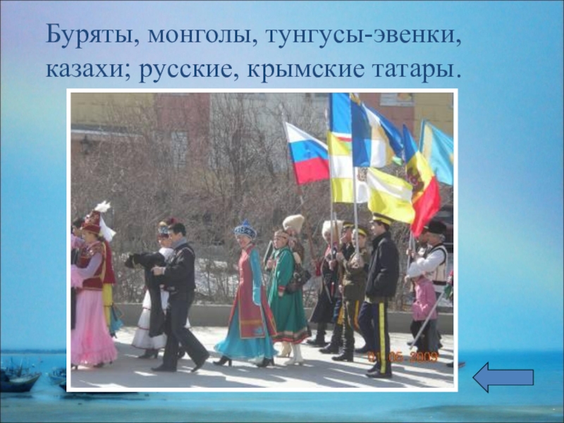 Слайд 66Буряты, монголы, тунгусы-эвенки, казахи; русские, крымские татары.