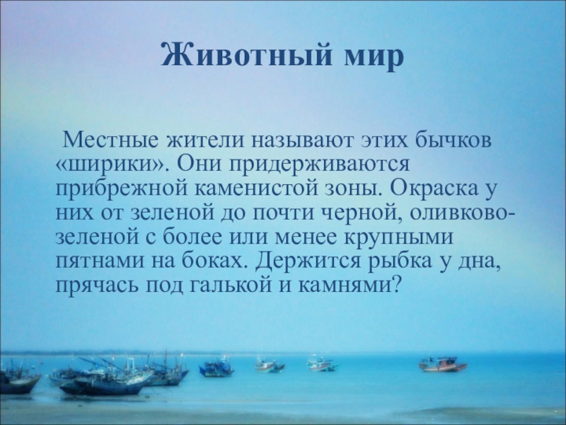 Местные жители называют этих бычков «ширики». Они придерживаются прибрежной каменистой