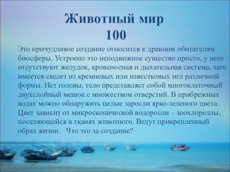 древним обитателям биосферы. Устроено это неподвижное существо просто, у него отсутствуют желудок, кровеносная и дыхательная система, зато имеется скелет из кремневых или известковых игл различной формы. Нет головы, тело представляет собой многоклеточный двухслойный мешок с множеством отверстий. В прибрежных водах можно обнаружить целые заросли ярко-зеленого цвета. Цвет зависит от микроскопической водоросли – зоохлореллы, поселяющейся в тканях животного. Ведут прикрепленный образ жизни. Что это за создание?