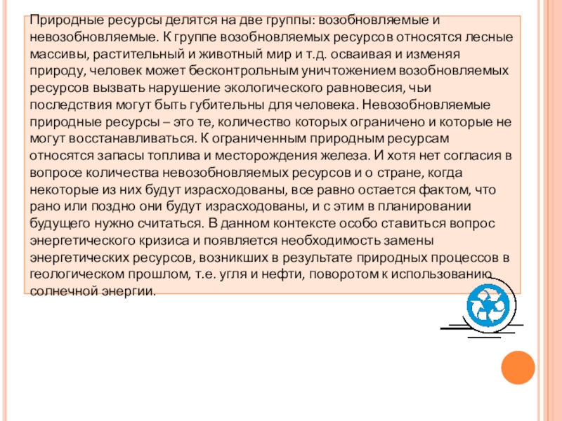 возобновляемых ресурсов относятся лесные массивы, растительный и животный мир и т.д. осваивая и изменяя природу, человек может бесконтрольным уничтожением возобновляемых ресурсов вызвать нарушение экологического равновесия, чьи последствия могут быть губительны для человека. Невозобновляемые природные ресурсы – это те, количество которых ограничено и которые не могут восстанавливаться. К ограниченным природным ресурсам относятся запасы топлива и месторождения железа. И хотя нет согласия в вопросе количества невозобновляемых ресурсов и о стране, когда некоторые из них будут израсходованы, все равно остается фактом, что рано или поздно они будут израсходованы, и с этим в планировании будущего нужно считаться. В данном контексте особо ставиться вопрос энергетического кризиса и появляется необходимость замены энергетических ресурсов, возникших в результате природных процессов в геологическом прошлом, т.е. угля и нефти, поворотом к использованию солнечной энергии.