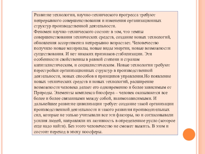 Феномен научно-технического состоит в том, что темпы совершенствования технических средств, создание новых технологий, обновления ассортимента непрерывно возрастает. Человечество получило новые материалы, новые виды энергии, новые возможности существования. И нет никаких признаков стабилизации. Эти особенности свойственны в равной степени и странам капиталистическим, и социалистическим. Новые технологии требуют перестройки организационных структур в производственной деятельности, новых способов и принципов управления.Но появление новых технических средств и новых технологий, расширение возможности человека делает его одновременно и более зависимым от Природы. Элементы комплекса биосфера – человек оказываются все более и более связанными между собой, взаимозависимыми. И дальнейшее развитие цивилизации требует создание такой организации производственной деятельности и такого развития производительных сил, которые не только учитывали все эти факторы, но и согласовывали усилия людей, направляли их активность в определенное русло (которое еще надо найти). Без этого человечество не сможет выжить. В этом и состоит переход в эпоху ноосферы.