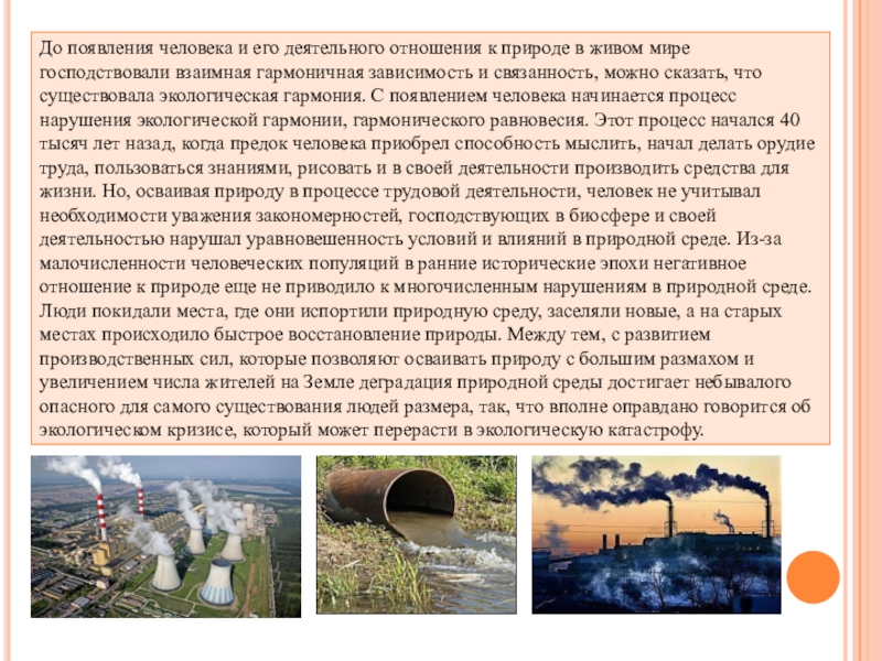 мире господствовали взаимная гармоничная зависимость и связанность, можно сказать, что существовала экологическая гармония. С появлением человека начинается процесс нарушения экологической гармонии, гармонического равновесия. Этот процесс начался 40 тысяч лет назад, когда предок человека приобрел способность мыслить, начал делать орудие труда, пользоваться знаниями, рисовать и в своей деятельности производить средства для жизни. Но, осваивая природу в процессе трудовой деятельности, человек не учитывал необходимости уважения закономерностей, господствующих в биосфере и своей деятельностью нарушал уравновешенность условий и влияний в природной среде. Из-за малочисленности человеческих популяций в ранние исторические эпохи негативное отношение к природе еще не приводило к многочисленным нарушениям в природной среде. Люди покидали места, где они испортили природную среду, заселяли новые, а на старых местах происходило быстрое восстановление природы. Между тем, с развитием производственных сил, которые позволяют осваивать природу с большим размахом и увеличением числа жителей на Земле деградация природной среды достигает небывалого опасного для самого существования людей размера, так, что вполне оправдано говорится об экологическом кризисе, который может перерасти в экологическую катастрофу.