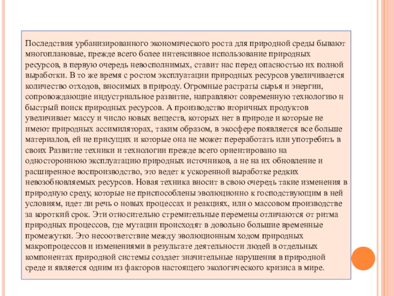 Слайд 16Последствия урбанизированного экономического роста для природной среды бывают многоплановые, прежде всего