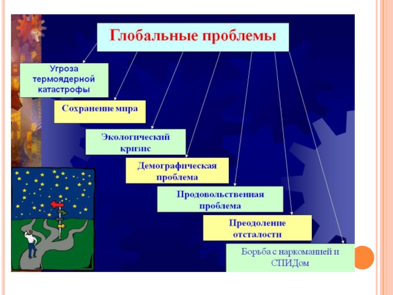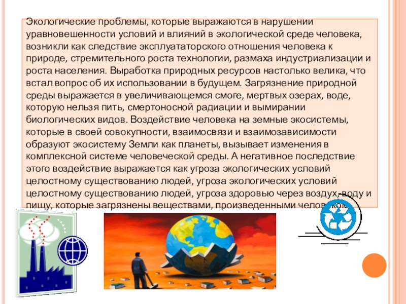 экологической среде человека, возникли как следствие эксплуататорского отношения человека к природе, стремительного роста технологии, размаха индустриализации и роста населения. Выработка природных ресурсов настолько велика, что встал вопрос об их использовании в будущем. Загрязнение природной среды выражается в увеличивающемся смоге, мертвых озерах, воде, которую нельзя пить, смертоносной радиации и вымирании биологических видов. Воздействие человека на земные экосистемы, которые в своей совокупности, взаимосвязи и взаимозависимости образуют экосистему Земли как планеты, вызывает изменения в комплексной системе человеческой среды. А негативное последствие этого воздействие выражается как угроза экологических условий целостному существованию людей, угроза экологических условий целостному существованию людей, угроза здоровью через воздух, воду и пищу, которые загрязнены веществами, произведенными человеком.