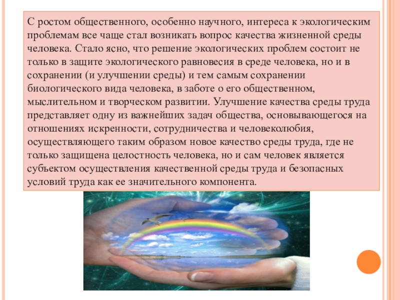 стал возникать вопрос качества жизненной среды человека. Стало ясно, что решение экологических проблем состоит не только в защите экологического равновесия в среде человека, но и в сохранении (и улучшении среды) и тем самым сохранении биологического вида человека, в заботе о его общественном, мыслительном и творческом развитии. Улучшение качества среды труда представляет одну из важнейших задач общества, основывающегося на отношениях искренности, сотрудничества и человеколюбия, осуществляющего таким образом новое качество среды труда, где не только защищена целостность человека, но и сам человек является субъектом осуществления качественной среды труда и безопасных условий труда как ее значительного компонента.