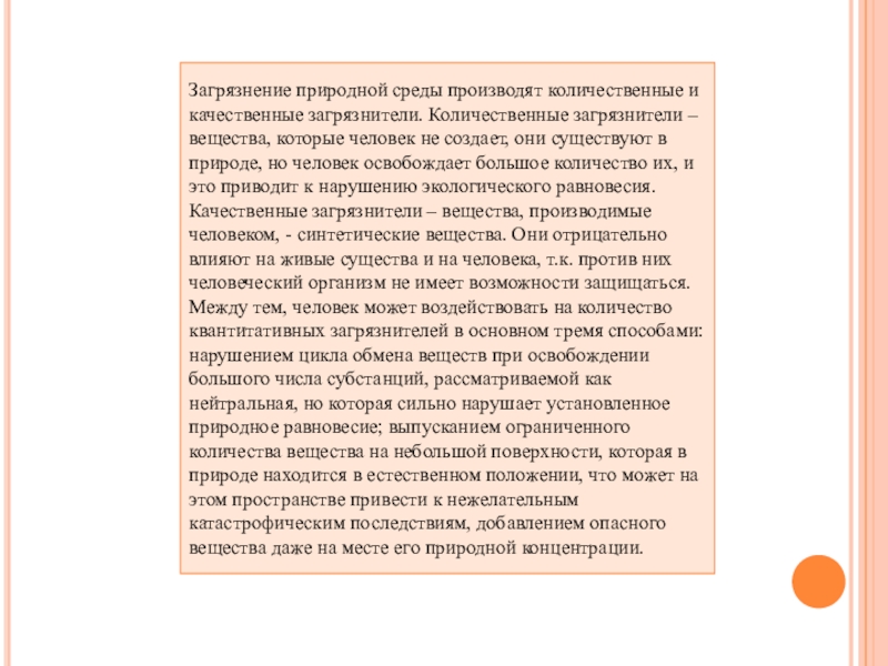 вещества, которые человек не создает, они существуют в природе, но человек освобождает большое количество их, и это приводит к нарушению экологического равновесия. Качественные загрязнители – вещества, производимые человеком, - синтетические вещества. Они отрицательно влияют на живые существа и на человека, т.к. против них человеческий организм не имеет возможности защищаться. Между тем, человек может воздействовать на количество квантитативных загрязнителей в основном тремя способами: нарушением цикла обмена веществ при освобождении большого числа субстанций, рассматриваемой как нейтральная, но которая сильно нарушает установленное природное равновесие; выпусканием ограниченного количества вещества на небольшой поверхности, которая в природе находится в естественном положении, что может на этом пространстве привести к нежелательным катастрофическим последствиям, добавлением опасного вещества даже на месте его природной концентрации.