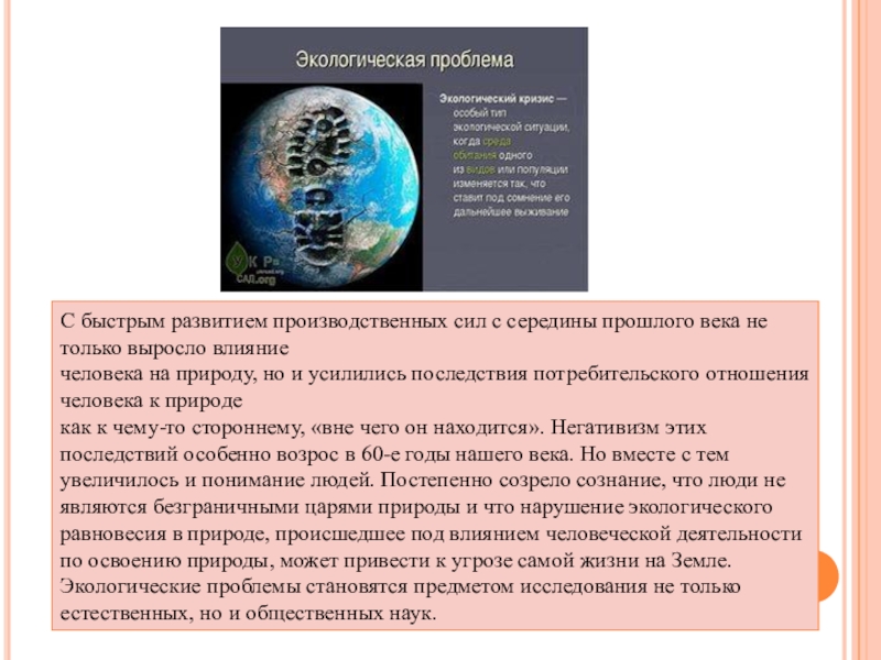 как к чему-то стороннему, «вне чего он находится». Негативизм этих последствий особенно возрос в 60-е годы нашего века. Но вместе с тем увеличилось и понимание людей. Постепенно созрело сознание, что люди не являются безграничными царями природы и что нарушение экологического равновесия в природе, происшедшее под влиянием человеческой деятельности по освоению природы, может привести к угрозе самой жизни на Земле.