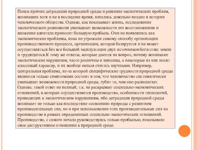 и не в последнее время, начались довольно поздно в истории человеческого общества. Однако, как показывает жизнь, исследование экологического равновесия уменьшает возможности его восстановления и вложение капитала приносит большую прибыль. Они не появлялись как экономические проблемы, пока не угрожали самому способу организации производственного процесса, организации, которая базируется и не может осуществляться без все большей эксплуатации двух источников богатства: земли и трудящегося.К тому же ответы, которые даются на вопрос, почему возникают экологические нарушения, часто различны и неполны, а некоторые из них носят классовый характер, и их вообще нельзя считать научными. Например, центральная проблема, из-за которой специфические трудности природной среды являются только симптомами состоит в том, что человечество систематически уменьшает возможности природной среды, губит то, чем оно располагает. Однако, такой ответ не полный, т.к. не раскрывает социально-экономических отношений, в которых осуществляется производство, особенности технологий, приводящих к экологическим нарушениям, ибо деградация природной среды возникает не только как последствие «освоения» природы с развитием производительных сил, но и при использовании этих производительных сил на производстве в рамках определенных социально-экологических отношений. Производство, с самого начала руководствуясь только прибылью, показывало свое деструктивное отношение к природной среде.