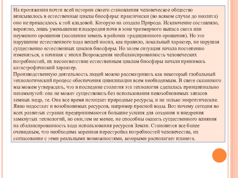 естественные циклы биосферы: практически (во всяком случае до неолита) оно не прикасалось к той кладовой. Которую на создала Природа. Исключение составляло, вероятно, лишь уменьшение плодородия почв в зоне чрезмерного выпаса скота или неумелого орошения (засоление земель в районах традиционного орошения). Но это нарушение естественного хода вещей носил, как правило, локальный характер, не нарушая существенно естественных циклов биосферы. Но затем ситуация начала постепенно изменяться, а начиная с эпохи Возрождения несбалансированность человеческих потребностей, их несоответствие естественным циклам биосферы начали принимать катастрофический характер.