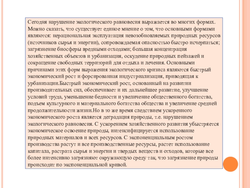 существует единое мнение о том, что основными формами являются: нерациональная эксплуатация невозобновляемых природных ресурсов (источников сырья и энергии), сопровождаемая опасностью быстро исчерпаться; загрязнение биосферы вредными отходами; большая концентрация хозяйственных объектов и урбанизация, оскудение природных пейзажей и сокращение свободных территорий для отдыха и лечения. Основными причинами этих форм выражения экологического кризиса являются быстрый экономический рост и форсированная индустриализация, приводящая к урбанизации.Быстрый экономический рост, основанный на развитии производительных сил, обеспечивает и их дальнейшее развитие, улучшение условий труда, уменьшение бедности и увеличение общественного богатства, подъем культурного и материального богатства общества и увеличение средней продолжительности жизни.Но в то же время следствием ускоренного экономического роста является деградация природы, т.е. нарушением экологического равновесия. С ускорением хозяйственного развития убыстряется экономическое освоение природы, интенсифицируется использование природных материалов и всех ресурсов. С экспоненциальным ростом производства растут и все производственные ресурсы, растет использование капитала, растрата сырья и энергии и твердых веществ и отходов, которые все более интенсивно загрязняют окружающую среду так, что загрязнение природы происходит по экспоненциальной кривой.