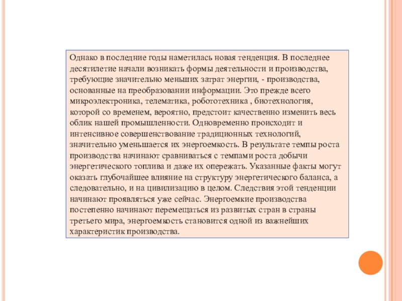 возникать формы деятельности и производства, требующие значительно меньших затрат энергии, - производства, основанные на преобразовании информации. Это прежде всего микроэлектроника, телематика, робототехника , биотехнология, которой со временем, вероятно, предстоит качественно изменить весь облик нашей промышленности. Одновременно происходит и интенсивное совершенствование традиционных технологий, значительно уменьшается их энергоемкость. В результате темпы роста производства начинают сравниваться с темпами роста добычи энергетического топлива и даже их опережать. Указанные факты могут оказать глубочайшее влияние на структуру энергетического баланса, а следовательно, и на цивилизацию в целом. Следствия этой тенденции начинают проявляться уже сейчас. Энергоемкие производства постепенно начинают перемещаться из развитых стран в страны третьего мира, энергоемкость становится одной из важнейших характеристик производства.