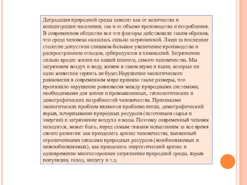 Слайд 13Деградация природной среды зависит как от количества и концентрации населения, так