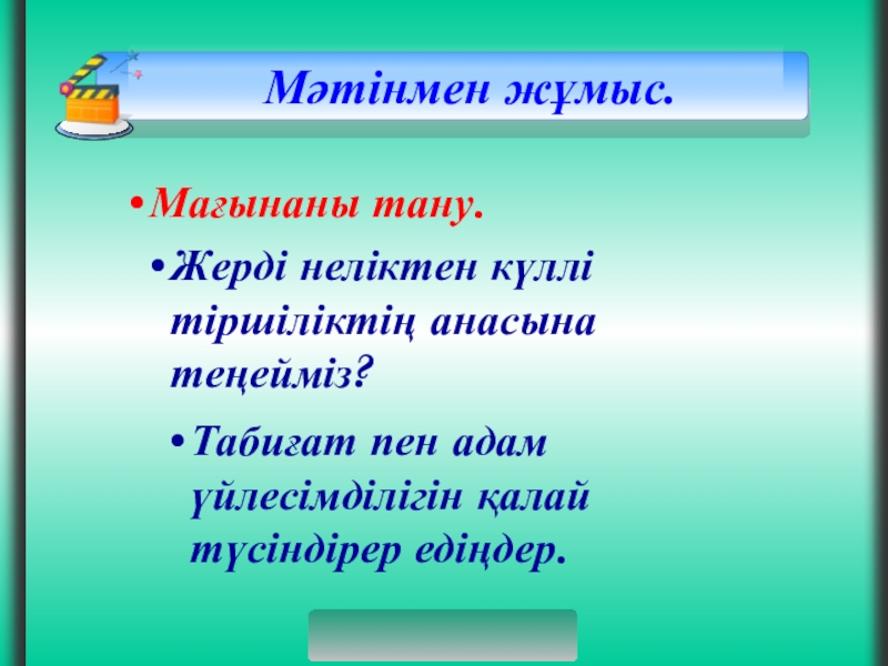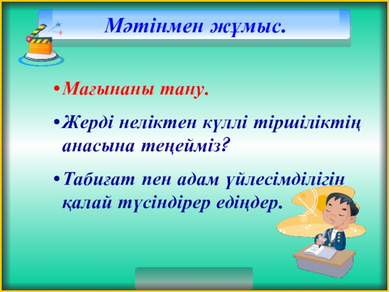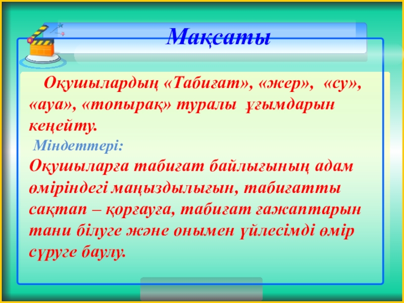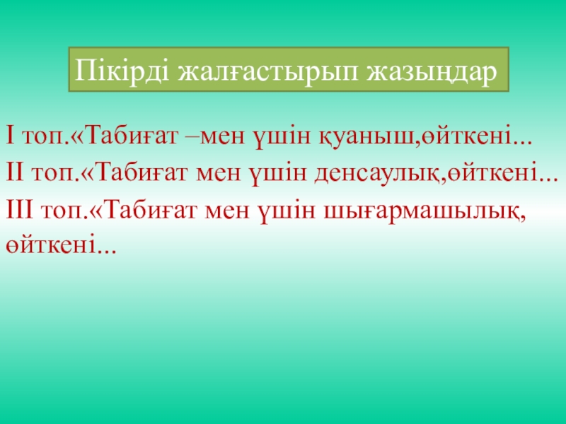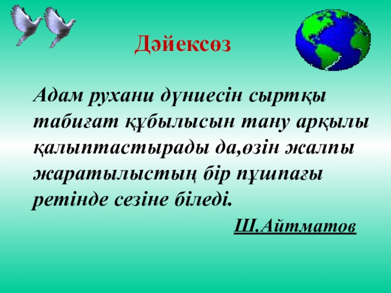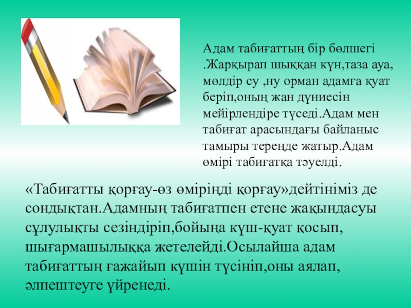 «Табиғатты қорғау-өз өміріңді қорғау»дейтініміз де сондықтан.Адамның табиғатпен етене жақындасуы сұлулықты сезіндіріп,бойыңа күш-қуат қосып,