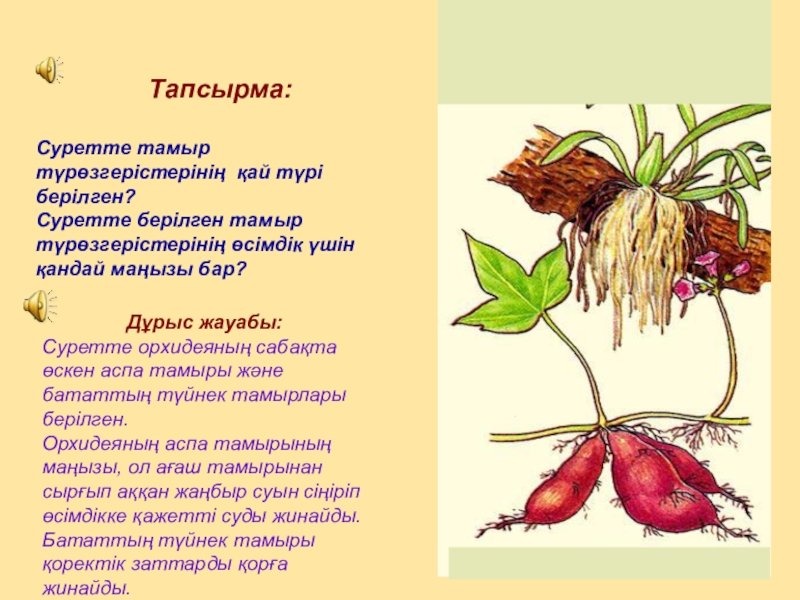 Суретте орхидеяның сабақта өскен аспа тамыры және бататтың түйнек тамырлары берілген.