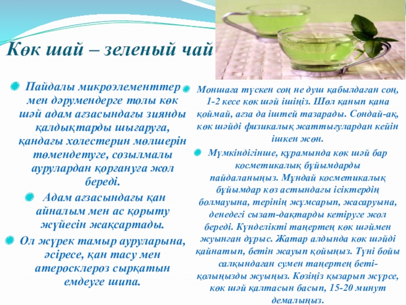Моншаға түскен соң не душ қабылдаған соң, 1-2 кесе көк шәй ішіңіз. Шөл қанып қана қоймай, ағза да іштей тазарады. Сондай-ақ, көк шәйді физикалық жаттығулардан кейін ішкен жөн.