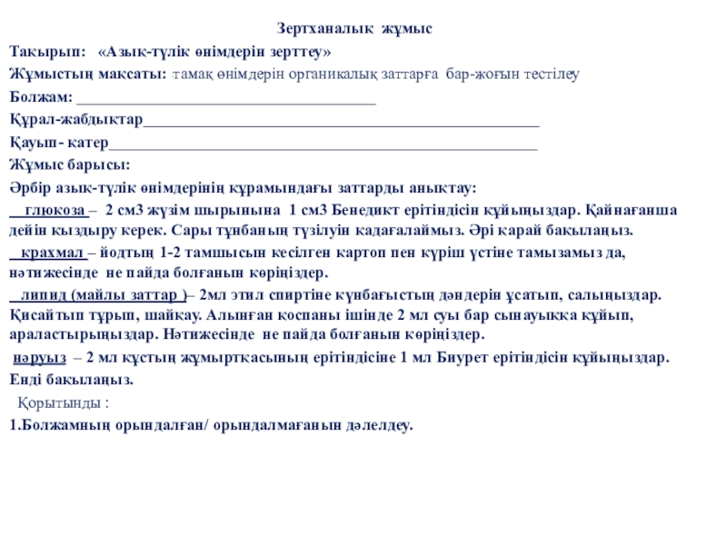 Слайд 1Азық-түлік өнімдерін органикалық заттарға тестілеу»