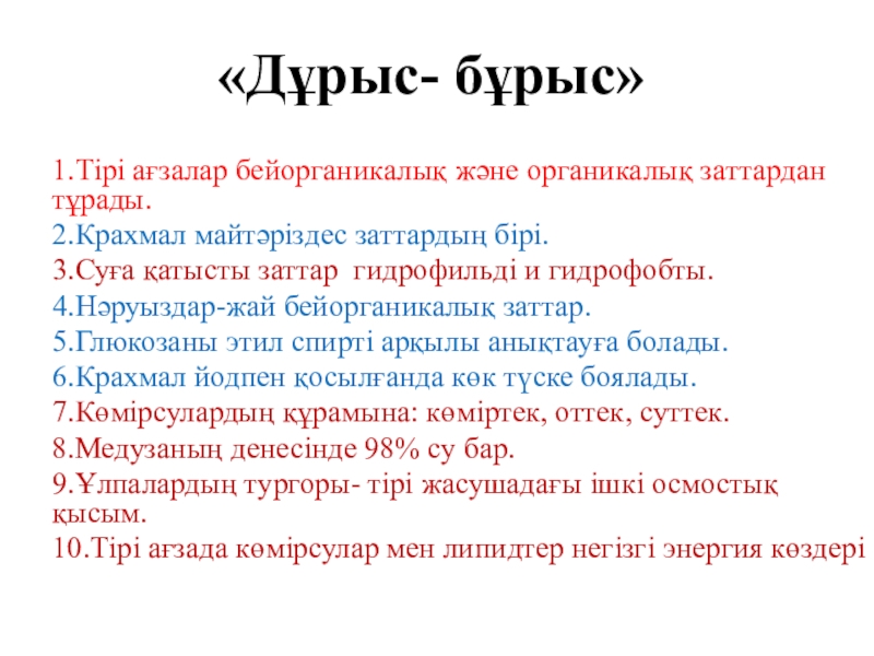 «Дұрыс- бұрыс»1.Тірі ағзалар бейорганикалық және органикалық заттардан тұрады.2.Крахмал майтәріздес заттардың бірі.3.Суға қатысты заттар гидрофильді и гидрофобты.4.Нәруыздар-жай