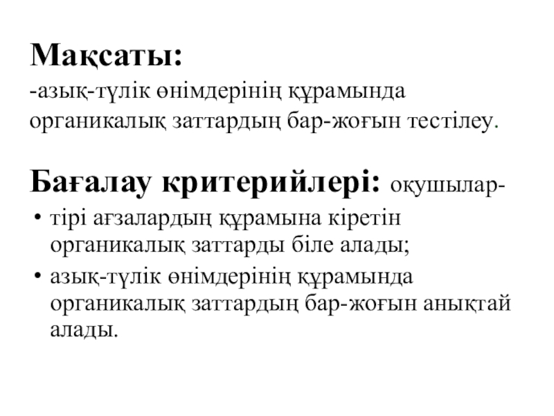 Слайд 2 Мақсаты: -азық-түлік өнімдерінің құрамында органикалық заттардың бар-жоғын тестілеу.
