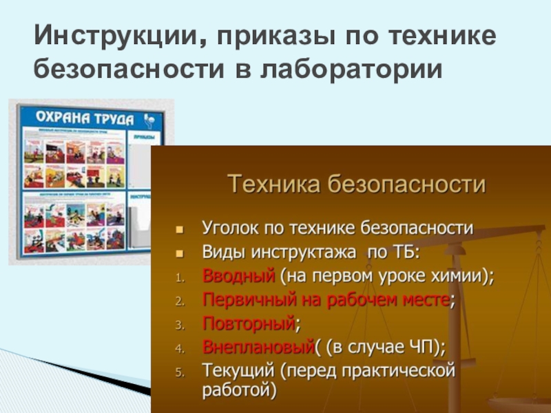 Слайд 9Инструкции, приказы по технике безопасности в лаборатории