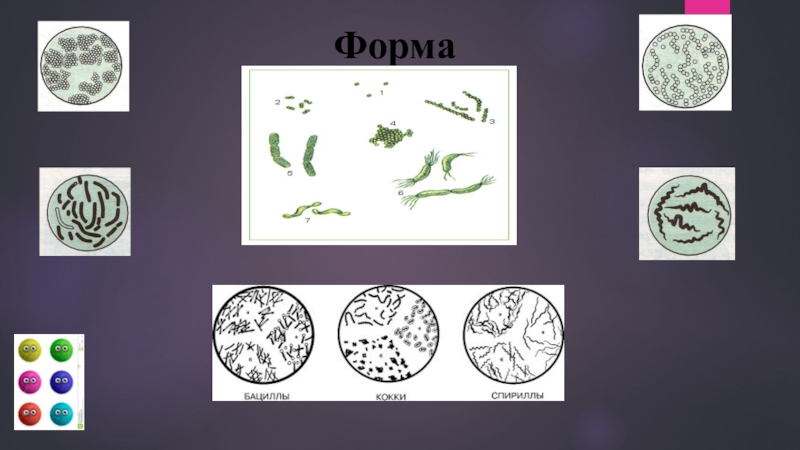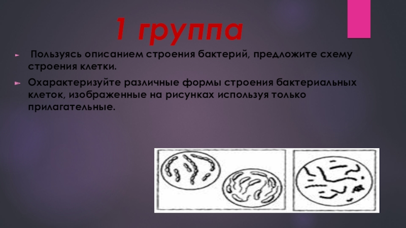 различные формы строения бактериальных клеток, изображенные на рисунках используя только прилагательные.