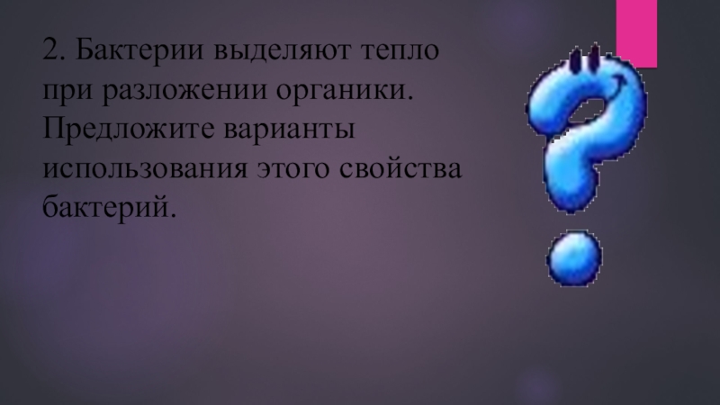 Слайд 322. Бактерии выделяют тепло при разложении органики. Предложите варианты использования этого