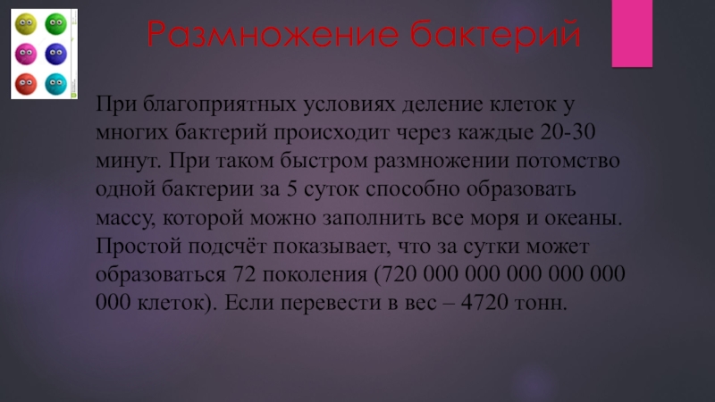 каждые 20-30 минут. При таком быстром размножении потомство одной бактерии за 5 суток способно образовать массу, которой можно заполнить все моря и океаны. Простой подсчёт показывает, что за сутки может образоваться 72 поколения (720 000 000 000 000 000 000 клеток). Если перевести в вес – 4720 тонн.