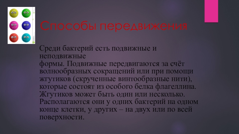 волнообразных сокращений или при помощи жгутиков (скрученные винтообразные нити), которые состоят из особого белка флагеллина. Жгутиков может быть один или несколько. Располагаются они у одних бактерий на одном конце клетки, у других – на двух или по всей поверхности.