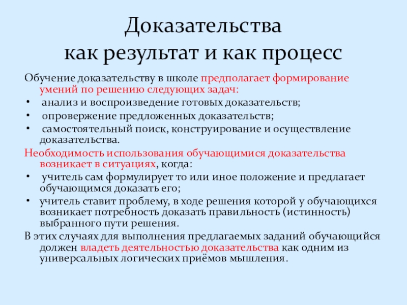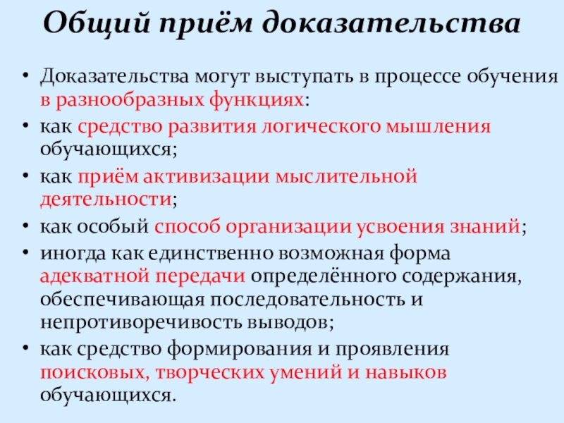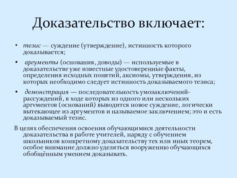 В целях обеспечения освоения обучающимися деятельности доказательства в работе учителей, наряду с обучением школьников конкретному доказательству тех или иных теорем, особое внимание должно уделяться вооружению обучающихся обобщённым умением доказывать.