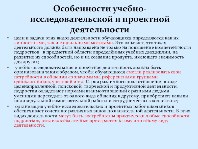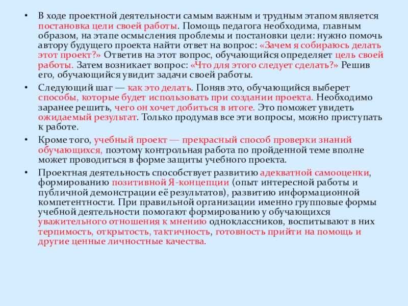 Установлено, что у обучающихся, занимающихся проектной деятельностью, учебная мотивация учения в целом выражена выше. Кроме того, с помощью проектной деятельности может быть существенно снижена школьная тревожность.