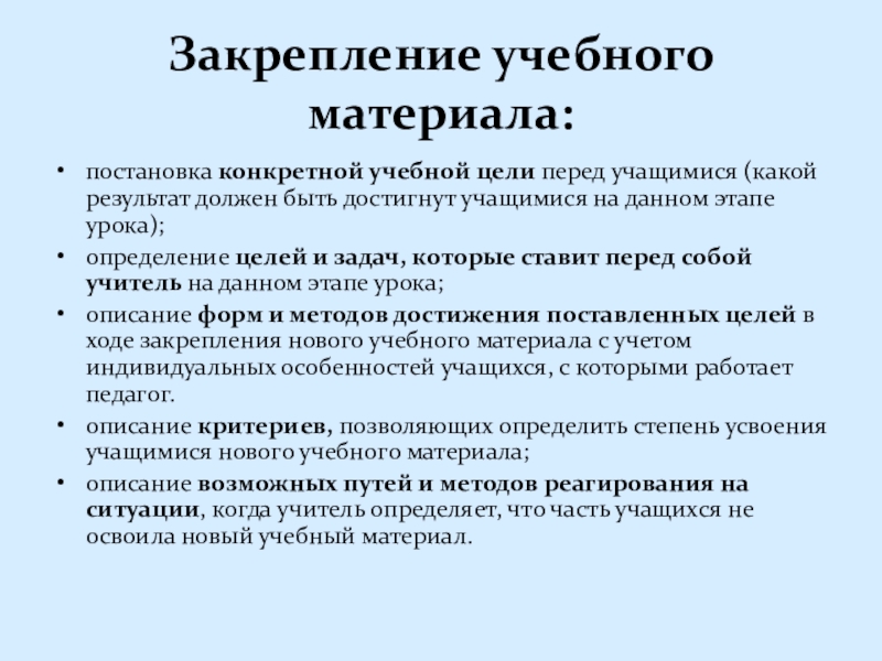 описание форм и методов достижения поставленных целей в ходе закрепления нового учебного материала с учетом индивидуальных особенностей учащихся, с которыми работает педагог.