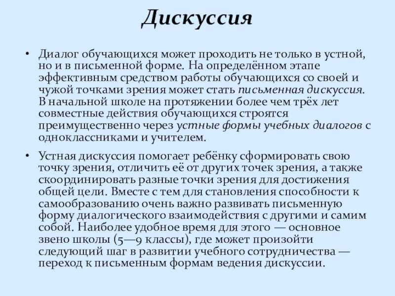 Устная дискуссия помогает ребёнку сформировать свою точку зрения, отличить её от других точек зрения, а также скоординировать разные точки зрения для достижения общей цели. Вместе с тем для становления способности к самообразованию очень важно развивать письменную форму диалогического взаимодействия с другими и самим собой. Наиболее удобное время для этого — основное звено школы (5—9 классы), где может произойти следующий шаг в развитии учебного сотрудничества — переход к письменным формам ведения дискуссии.