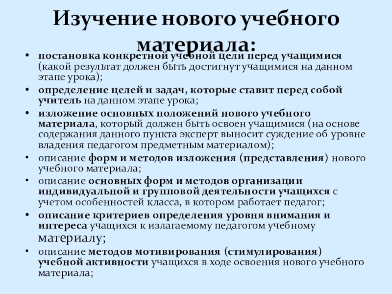 изложение основных положений нового учебного материала, который должен быть освоен учащимися (на основе содержания данного пункта эксперт выносит суждение об уровне владения педагогом предметным материалом);
