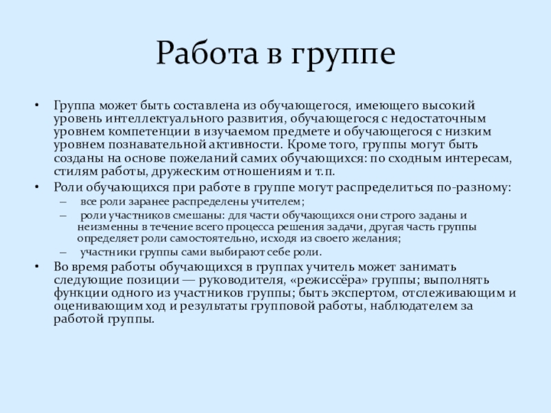 Роли обучающихся при работе в группе могут распределиться по-разному: