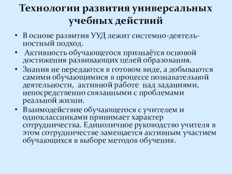 В основе развития УУД лежит системно-деятель-ностный подход.