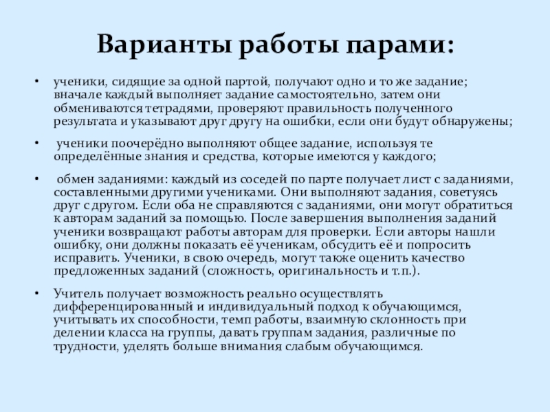 обмен заданиями: каждый из соседей по парте получает лист с заданиями, составленными другими учениками. Они выполняют задания, советуясь друг с другом. Если оба не справляются с заданиями, они могут обратиться к авторам заданий за помощью. После завершения выполнения заданий ученики возвращают работы авторам для проверки. Если авторы нашли ошибку, они должны показать её ученикам, обсудить её и попросить исправить. Ученики, в свою очередь, могут также оценить качество предложенных заданий (сложность, оригинальность и т.п.).