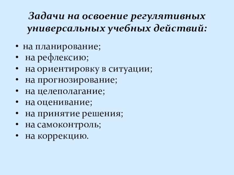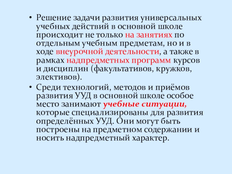 Среди технологий, методов и приёмов развития УУД в основной школе особое место занимают учебные ситуации, которые специализированы для развития определённых УУД. Они могут быть построены на предметном содержании и носить надпредметный характер.