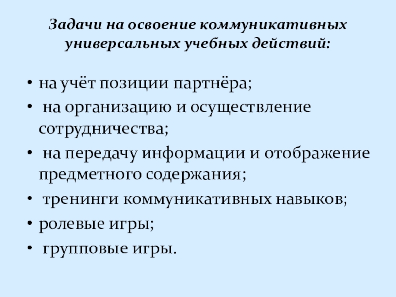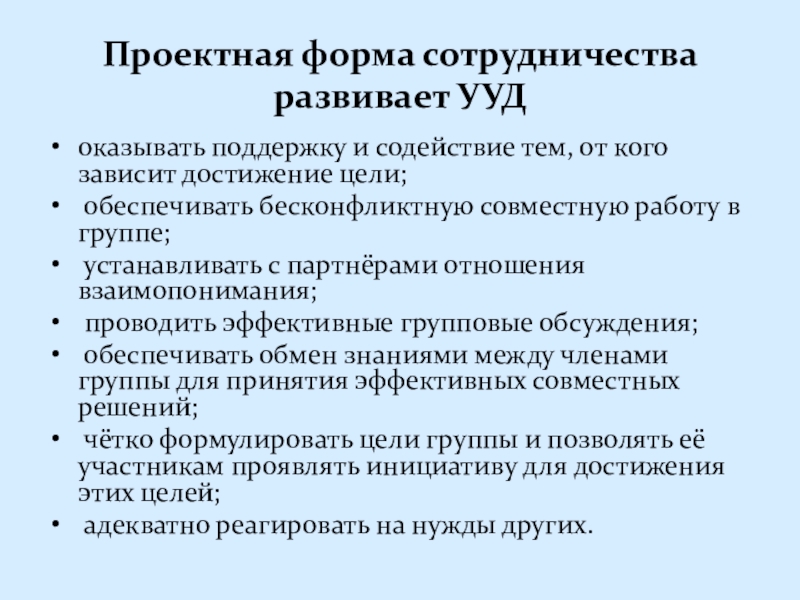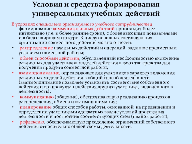 Совместная учебная деятельность характеризуется умением каждого из участников ставить цели совместной работы, определять способы совместного выполнения заданий и средства контроля, перестраивать свою деятельность в зависимости от изменившихся условий её совместного осуществления, понимать и учитывать при выполнении задания позиции других участников.