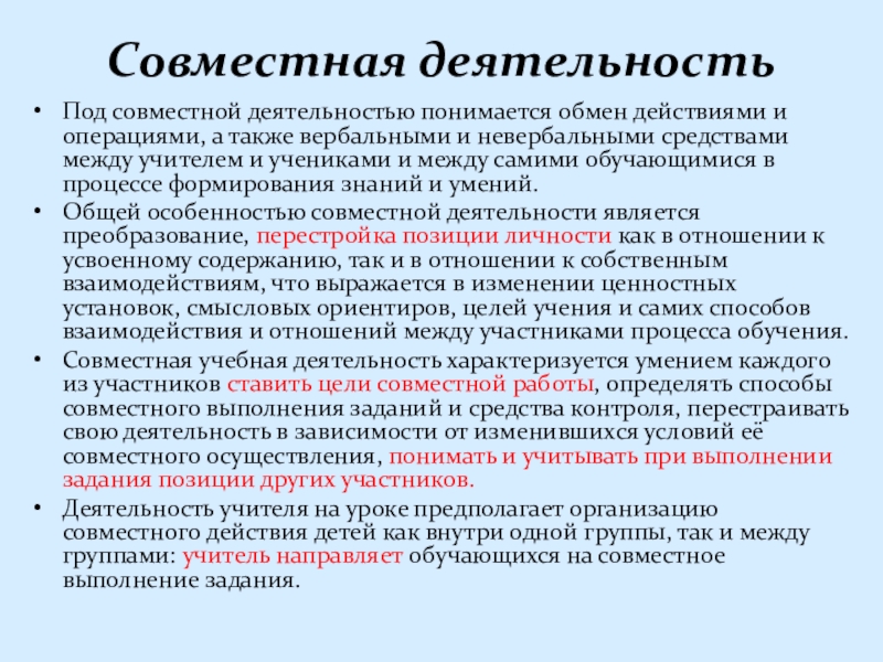 Общей особенностью совместной деятельности является преобразование, перестройка позиции личности как в отношении к усвоенному содержанию, так и в отношении к собственным взаимодействиям, что выражается в изменении ценностных установок, смысловых ориентиров, целей учения и самих способов взаимодействия и отношений между участниками процесса обучения.