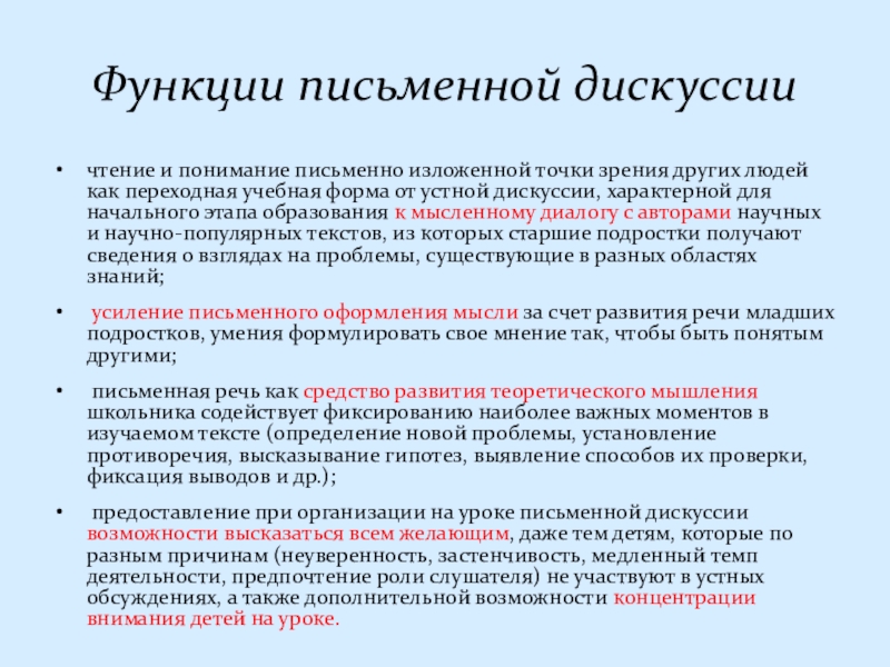 предоставление при организации на уроке письменной дискуссии возможности высказаться всем желающим, даже тем детям, которые по разным причинам (неуверенность, застенчивость, медленный темп деятельности, предпочтение роли слушателя) не участвуют в устных обсуждениях, а также дополнительной возможности концентрации внимания детей на уроке.