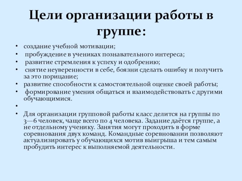 Для организации групповой работы класс делится на группы по 3—6 человек, чаще всего по 4 человека. Задание даётся группе, а не отдельному ученику. Занятия могут проходить в форме соревнования двух команд. Командные соревновании позволяют актуализировать у обучающихся мотив выигрыша и тем самым пробудить интерес к выполняемой деятельности.