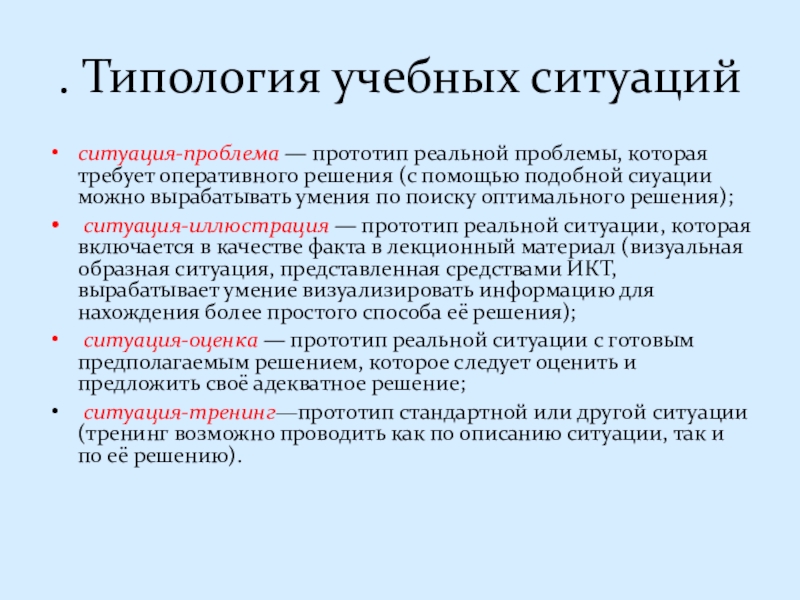 ситуация-иллюстрация — прототип реальной ситуации, которая включается в качестве факта в лекционный материал (визуальная образная ситуация, представленная средствами ИКТ, вырабатывает умение визуализировать информацию для нахождения более простого способа её решения);