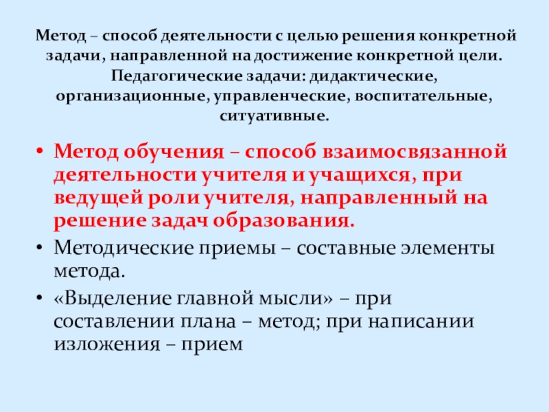 Метод обучения – способ взаимосвязанной деятельности учителя и учащихся, при ведущей роли учителя, направленный на решение задач образования.