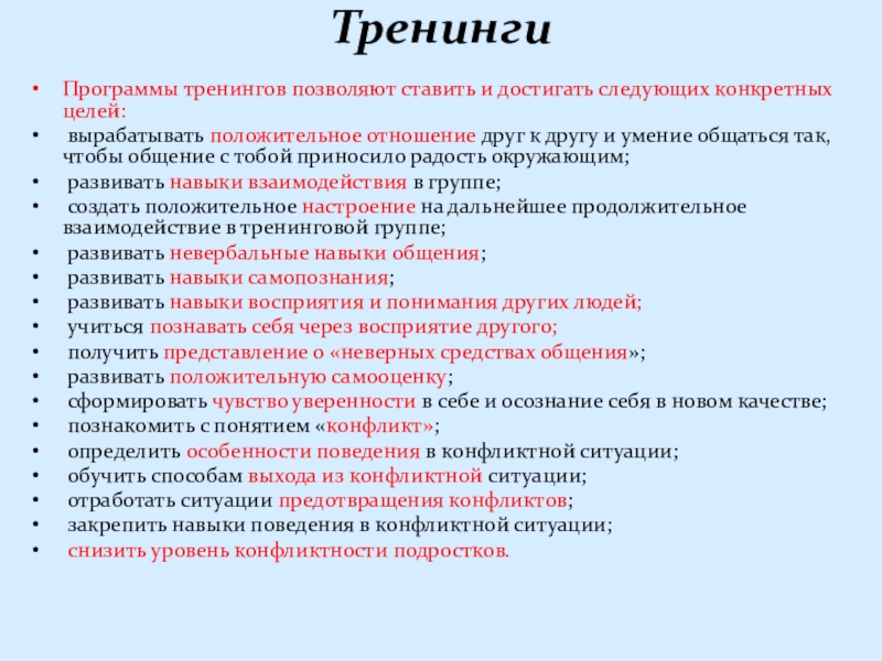 Программы тренингов позволяют ставить и достигать следующих конкретных целей: