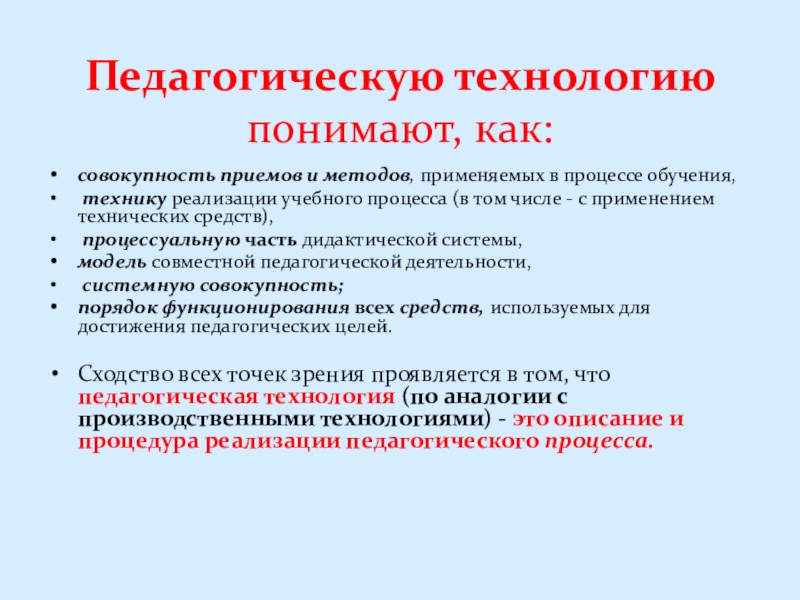 Сходство всех точек зрения проявляется в том, что педагогическая технология (по аналогии с производственными технологиями) - это описание и процедура реализации педагогического процесса.