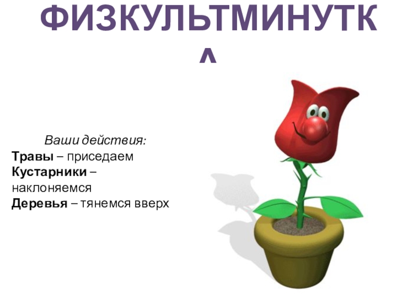 ФИЗКУЛЬТМИНУТКАВаши действия:Травы – приседаемКустарники – наклоняемсяДеревья – тянемся вверх